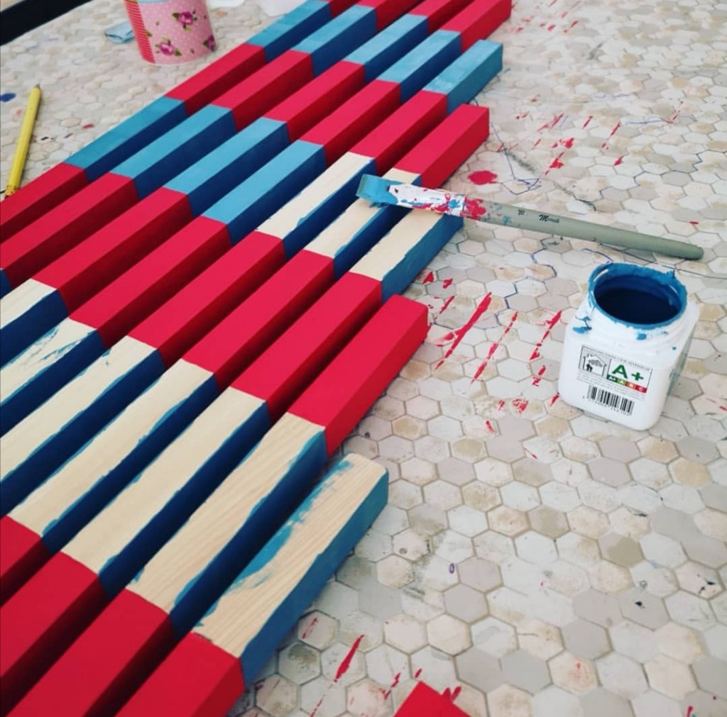 Pour les faire, il vous faudra 3 tasseaux de 2,50m de long et 2,50cm de côtés (je n’ai trouvé qu’en 2,10cm de côté), peinture rouge et bleu ainsi que du vernis satiné, sans compter les outils comme la scie, le mètre et un crayon papier.