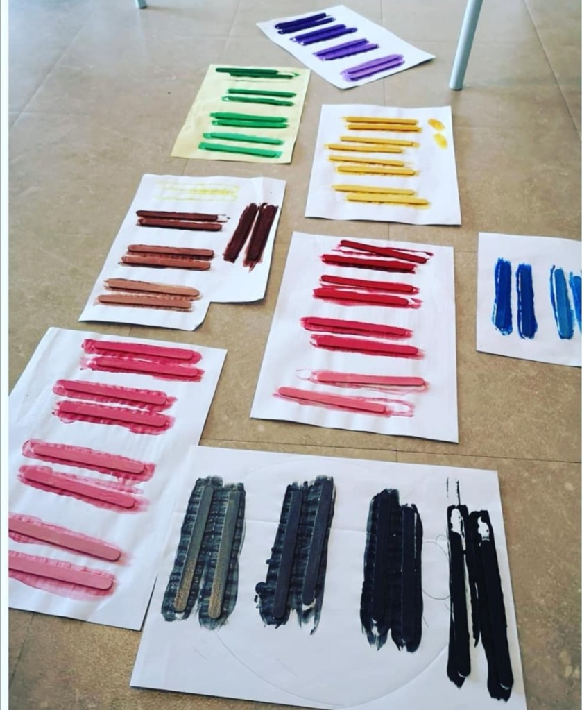 Pour avoir du matériel inspiré de la boîte de couleurs n°3 Montessori, j’ai fait les dégradés avec des bâtonnets.