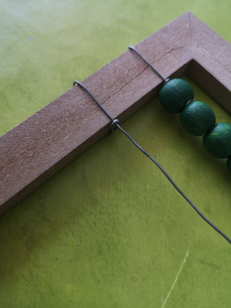 J’ai utilisé un cadre en bois pour le contour. Les perles sont enfilées sur du fil de fer que j’ai enroulé autour du cadre.