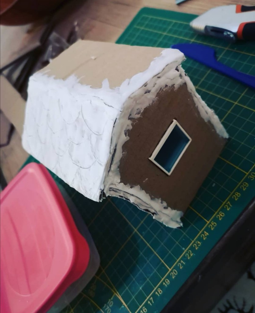 Les murs ainsi que les toits ont été découpés dans du carton et collés à la colle blanche.