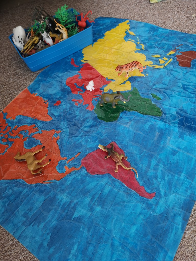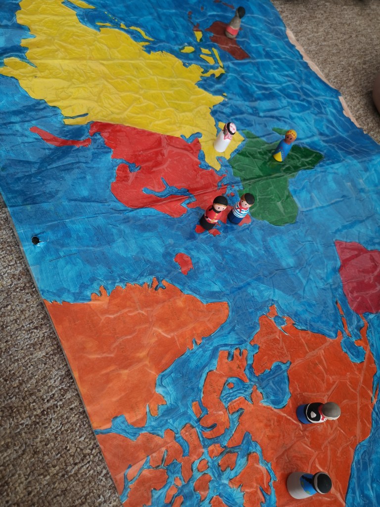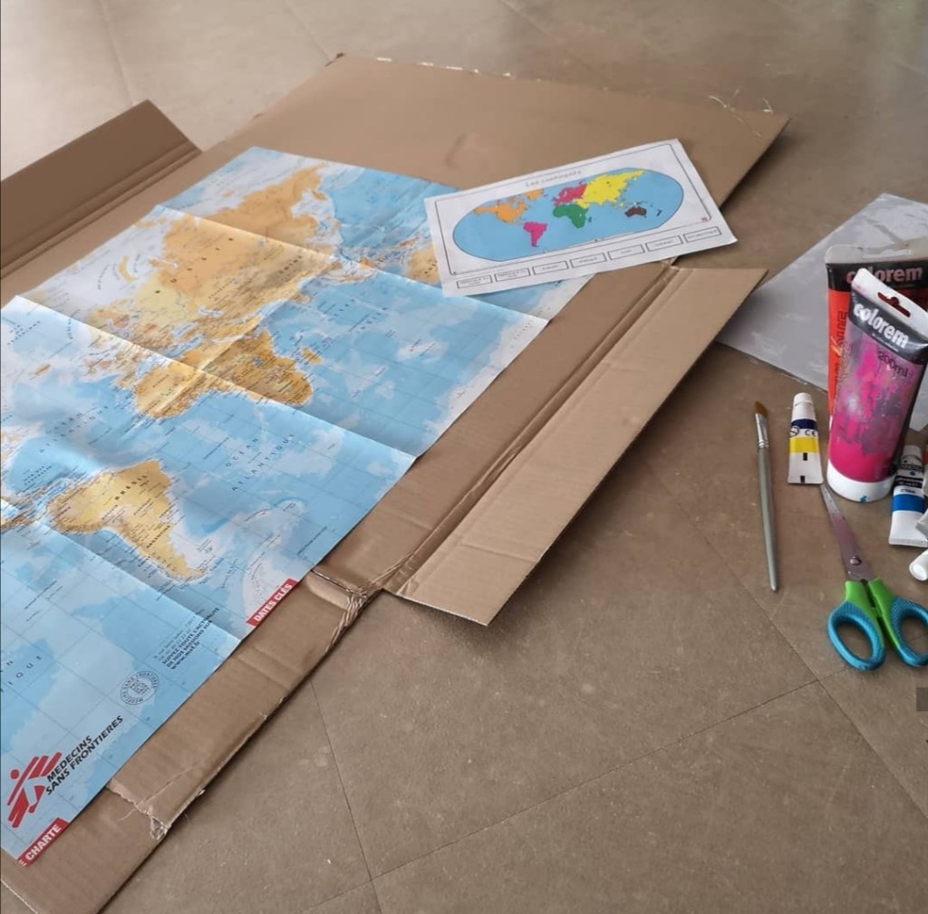 Pour agrémenter nos séances de géographie et notamment notre tour du monde, j’ai fait une grande mappemonde en utilisant une carte du monde classique.
