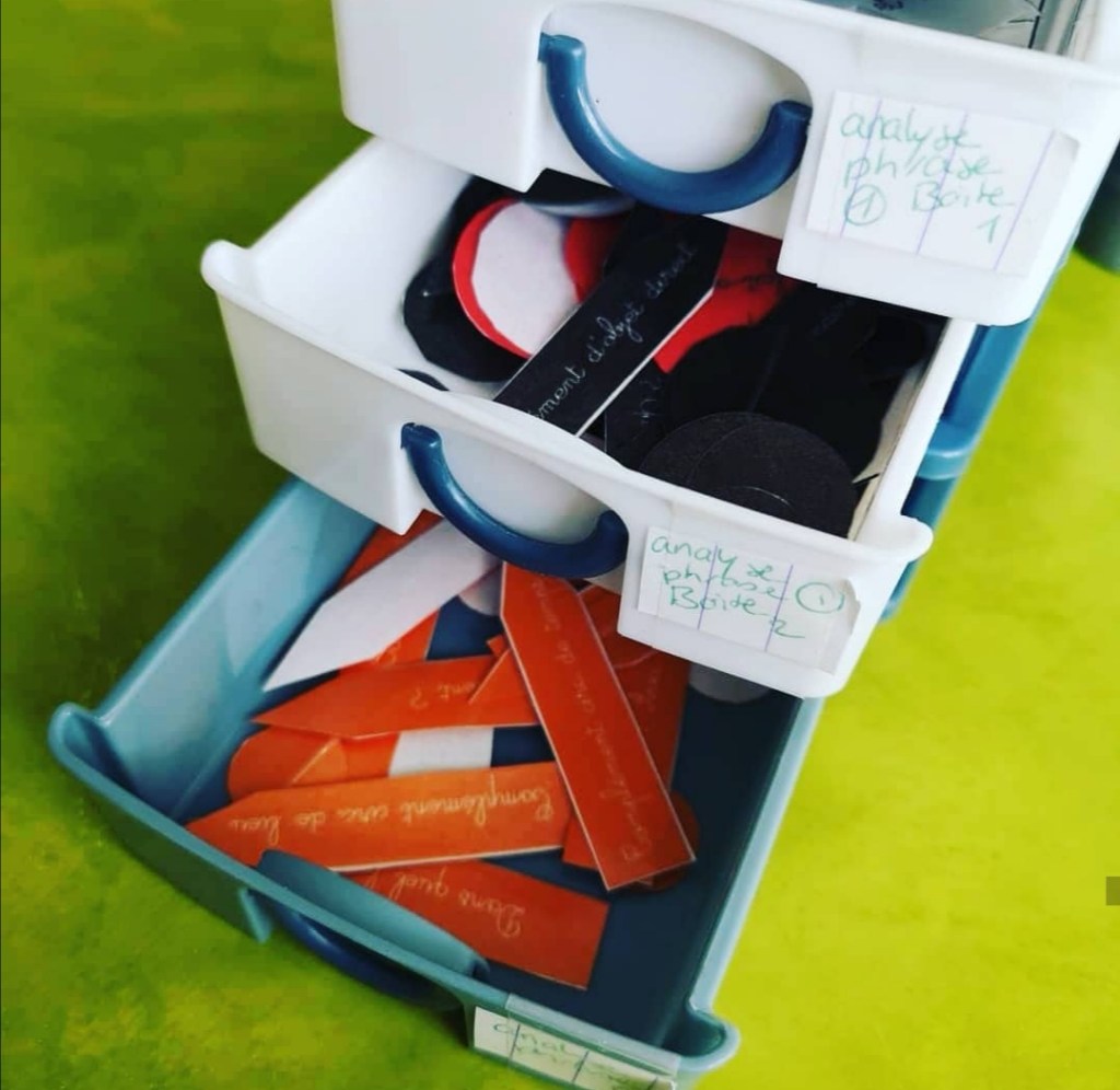 Dessus j’ai collé des petites pochettes en papier avec le schéma que représentera chaque analyse, ainsi je pioche directement la phrase que je veux leur proposer selon la difficulité.