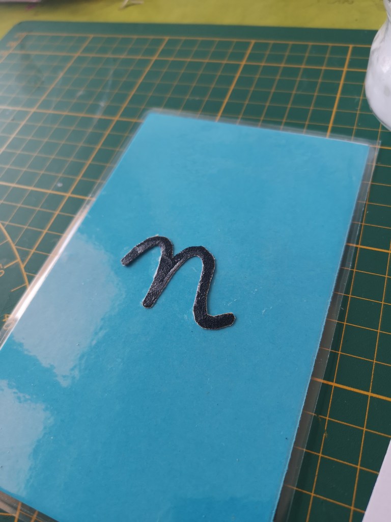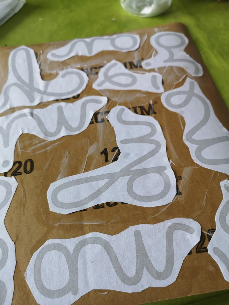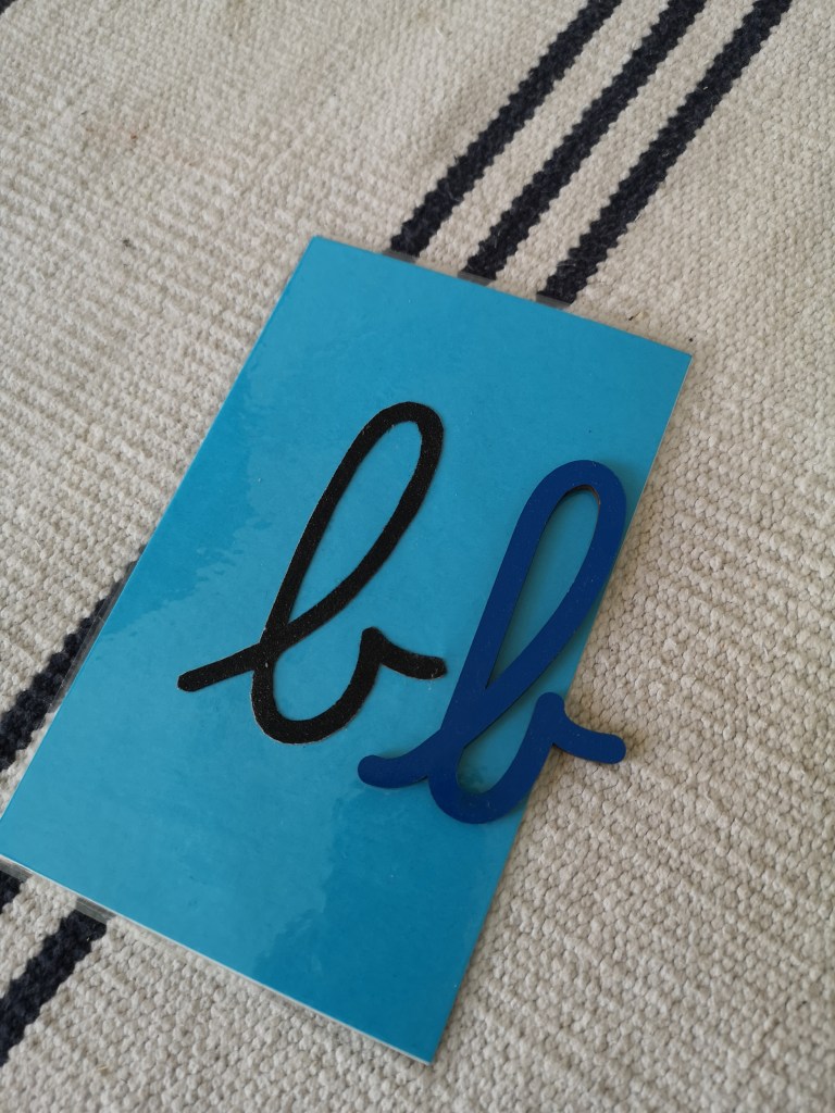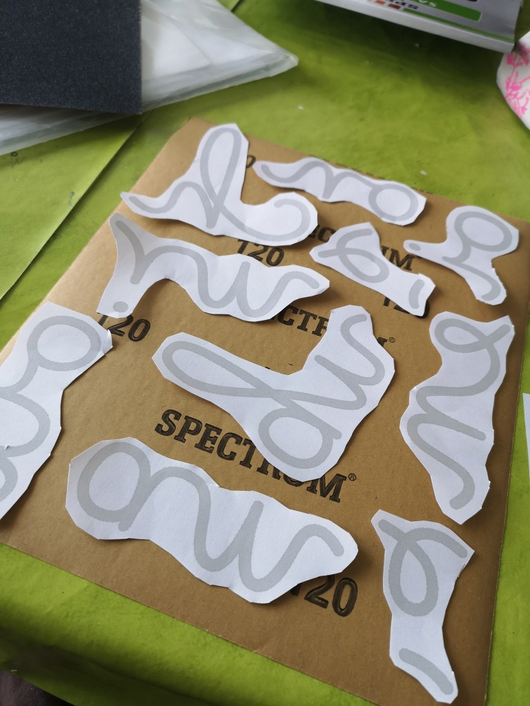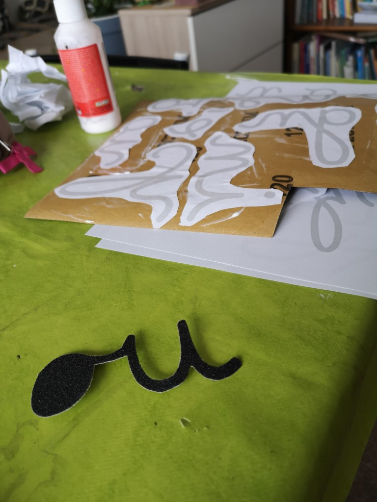 J’ai refait mes lettres rugueuses, j’en profite pour un petit tuto. Le support de chaque lettre est fait avec le même procédé que pour les chiffres rugueux. Pour les lettres, j’ai utilisé du papier de verre de chez action, il m’a paru trop épais, et finalement après découpe c’est très bien, les lettres étant fines, un grain trop fin, n’aurait peut-être pas apporter autant au toucher.