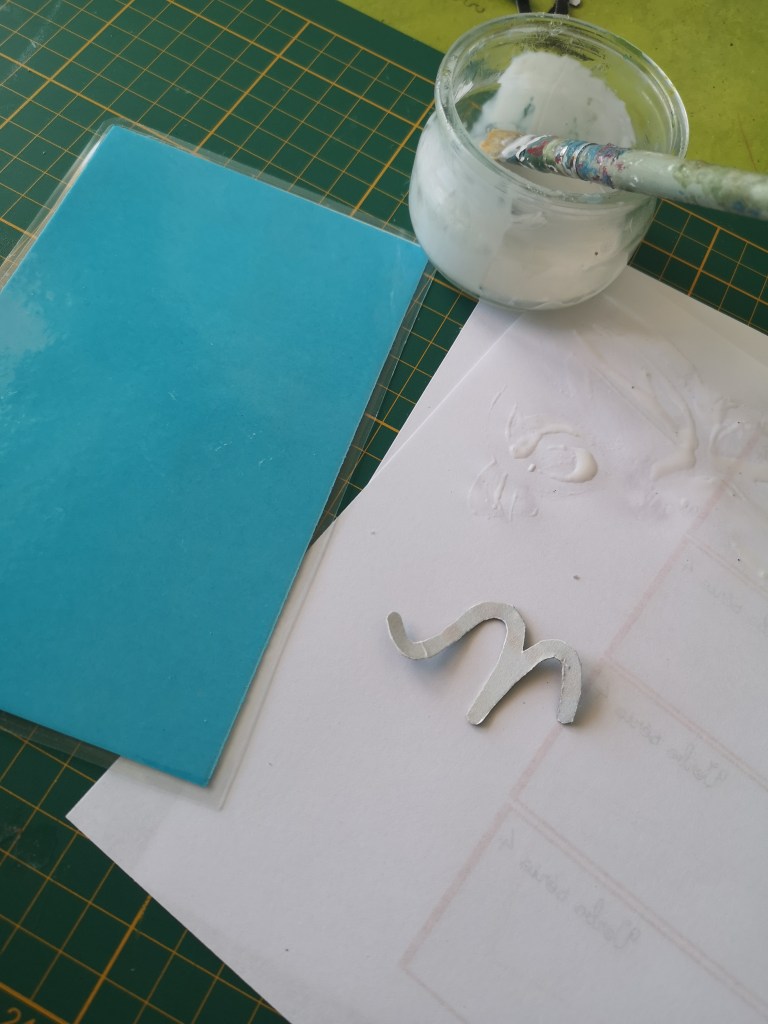 Les lettres sont ensuite collées à la colle blanche sur les supports préalablement préparés.