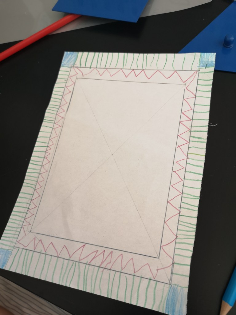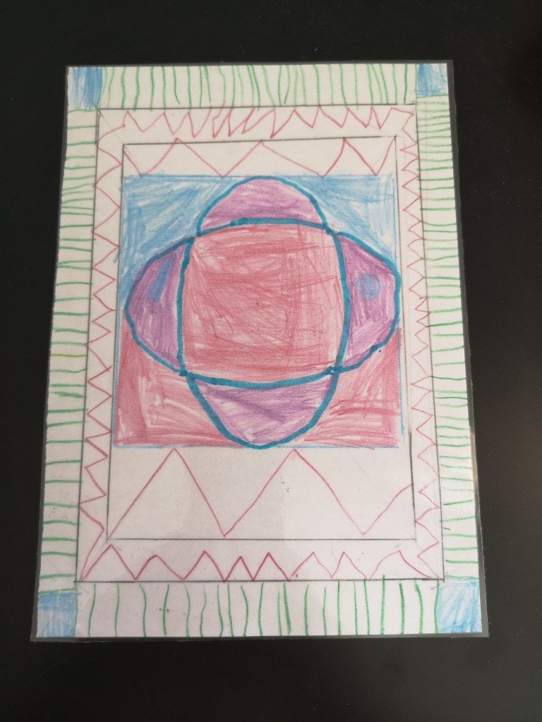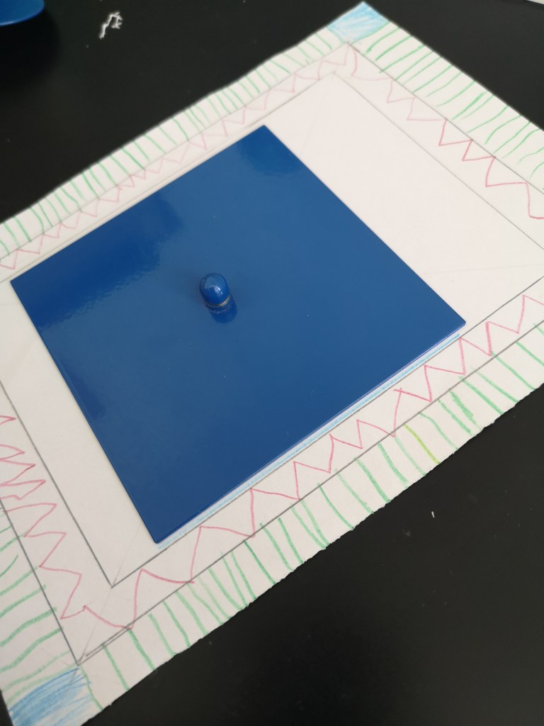 Après avoir bien travaillé avec les solides et le cabinet de géométrie en vie sensorielle, on va exploiter les formes à dessins (partie langage initialement) pour faire des dessins artistiques géométriques. J’ai montré à mon fils comment, en superposant plusieurs formes, il pouvait faire de beaux dessins en variant les couleurs, un triangle dans un rond, deux triangle superposés dans un carré, etc… il a travaillé dessus tous les jours. Ensuite est venu le temps de lui dire que ses jolis dessins seraient encore plus beaux mis en valeur avec un cadre, ce qu’il a bien sûr acquiescé immédiatement.