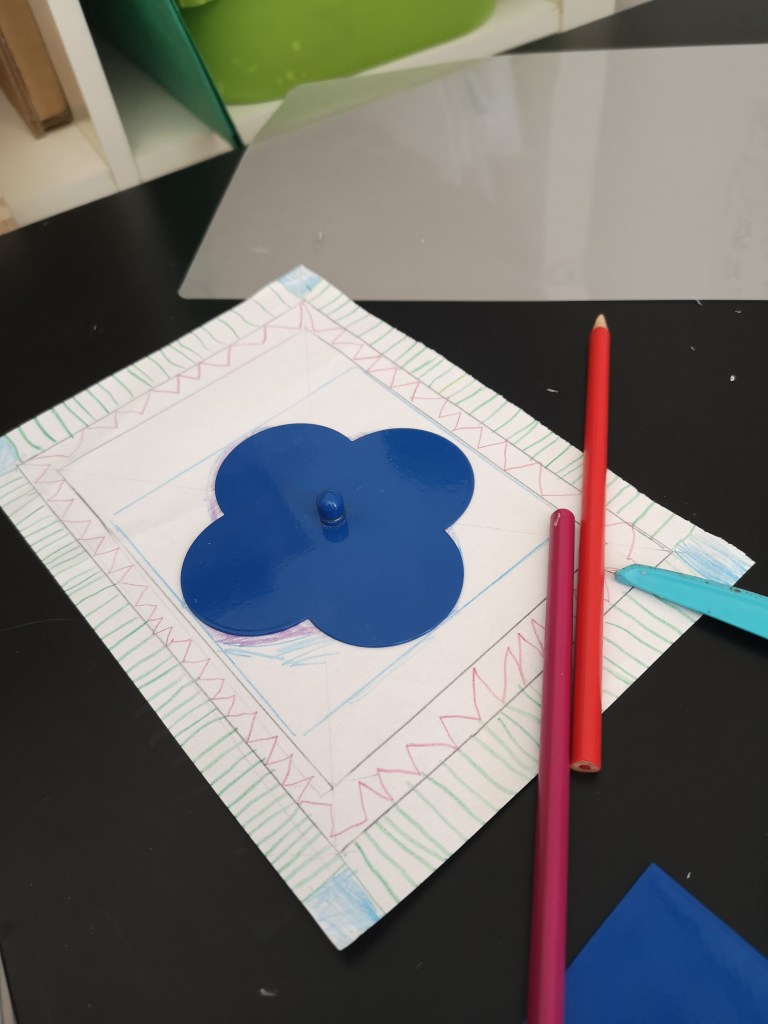 En coloriant, il réalise qu’il a dessiné un quadrilobe et va chercher la forme pour vérifier.